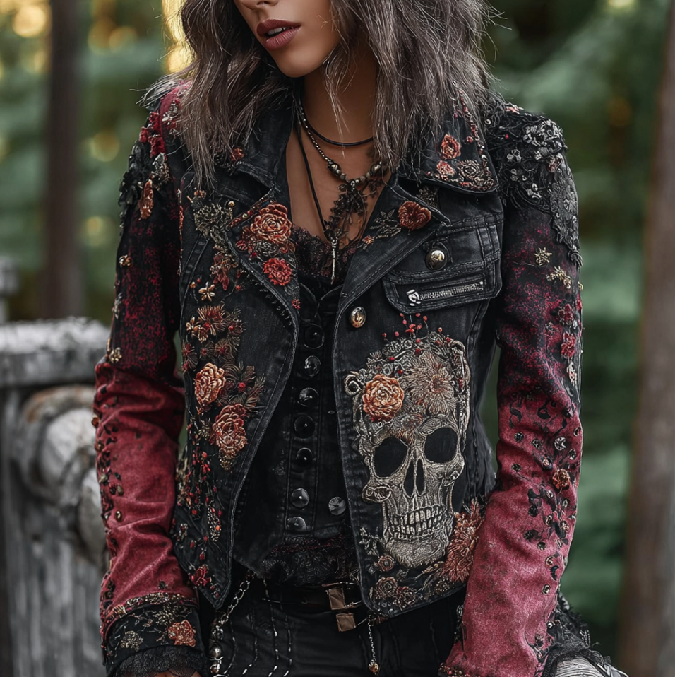 A Retro Women's Black-pink Gradient Denim Jacket With Gothic Skull And Floral Elements Design For Halloween.