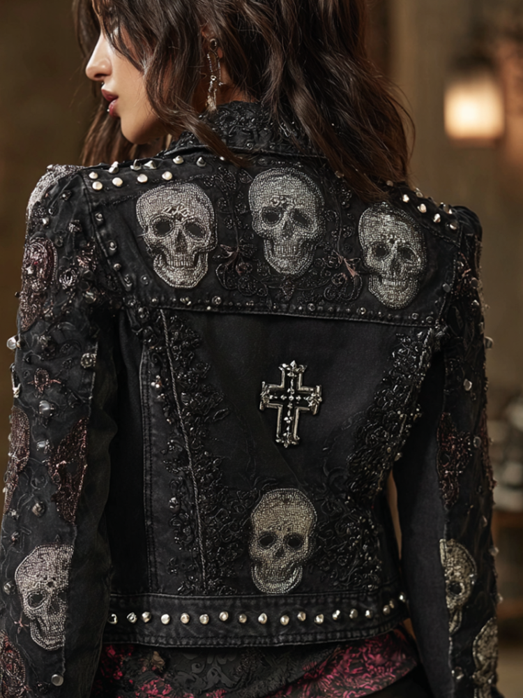 A Retro Women's Gradient Denim Jacket With Gothic Skull And Floral Elements Design For Halloween.
