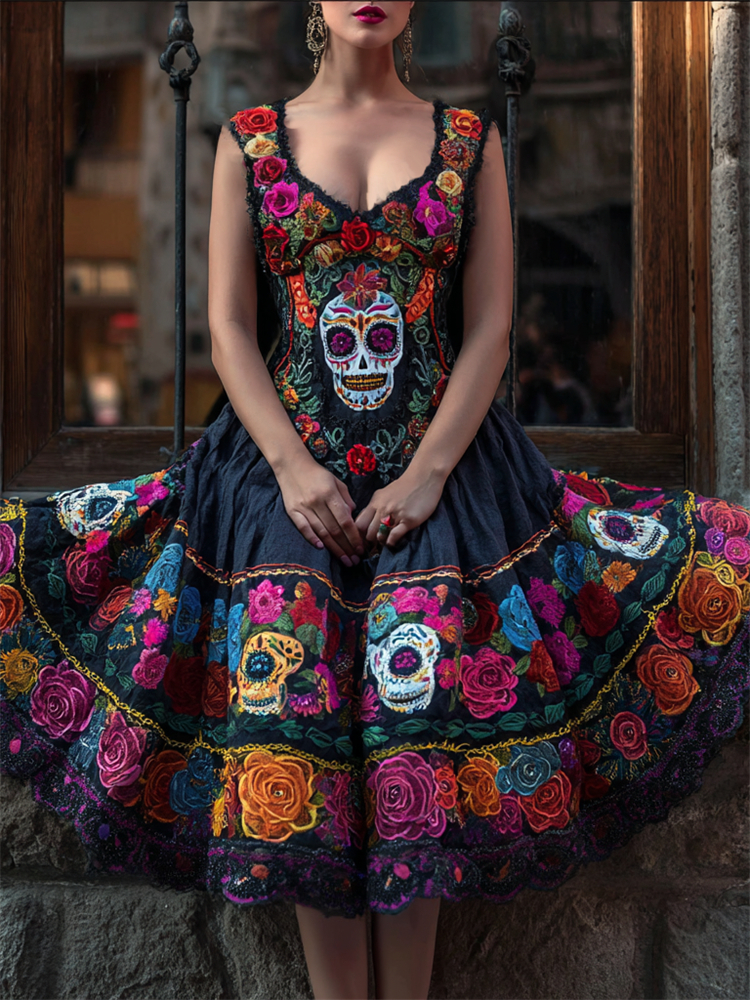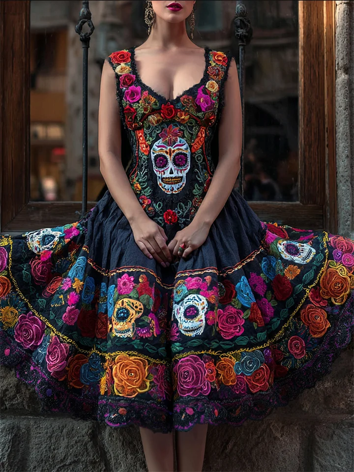 Day Of The Dead Sugar Skulls Roses Floral Linen Dress