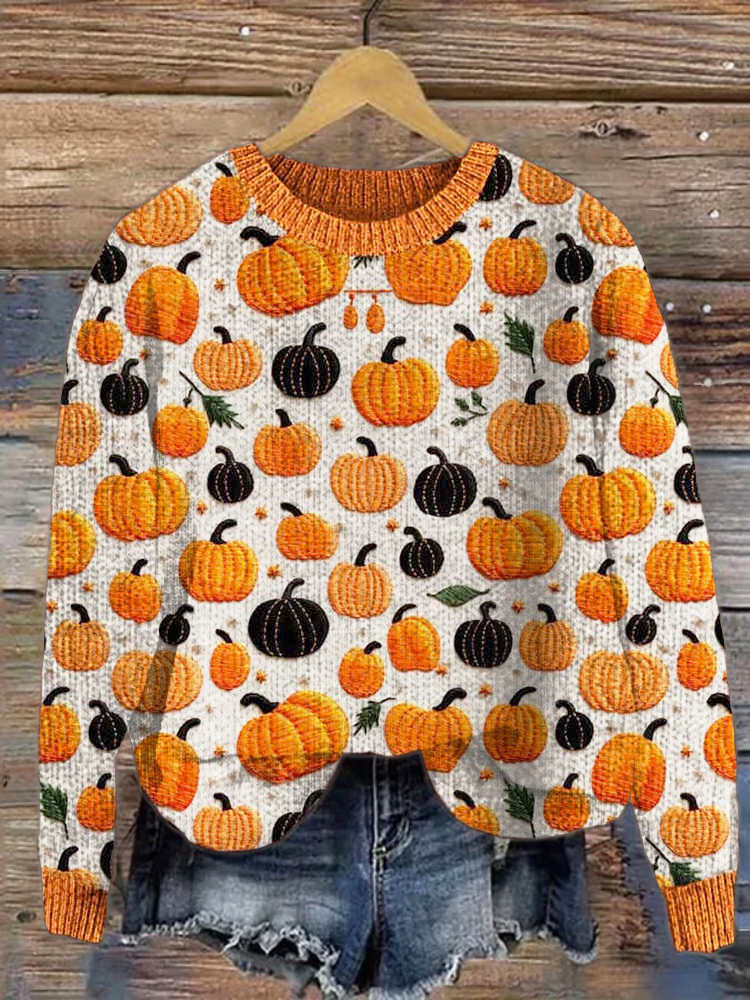 Halloween Pumpkin Embroidery Women's Crew Neck Sweater