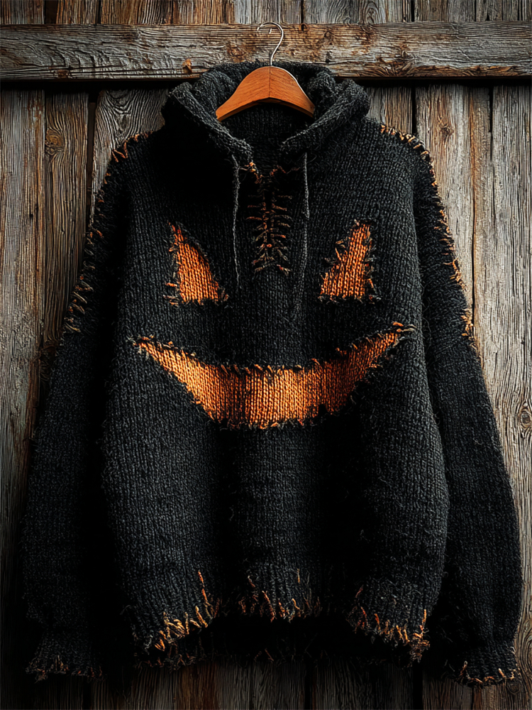 Halloween Pumpkin Face Stitched Cozy Knit Hooded Sweater