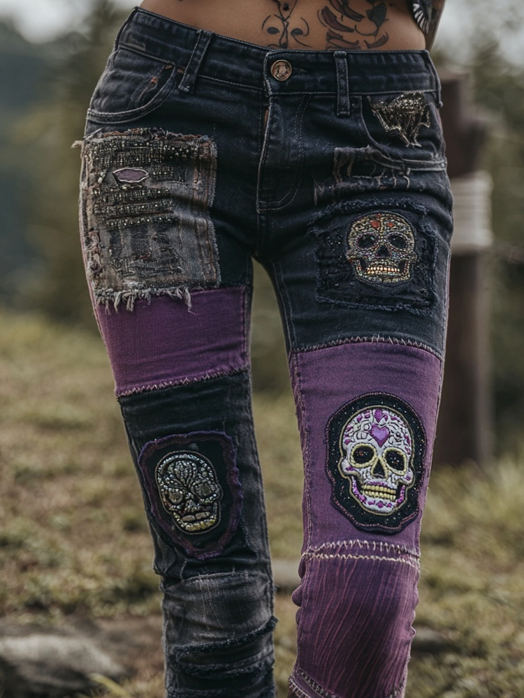 Halloween Skull Embroidered Patchwork Washed Skinny Jeans