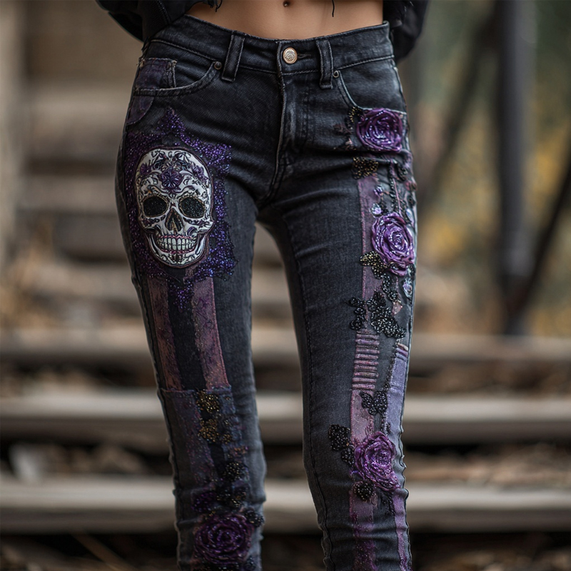 Halloween Skull & Roses Embroidered Washed Skinny Jeans