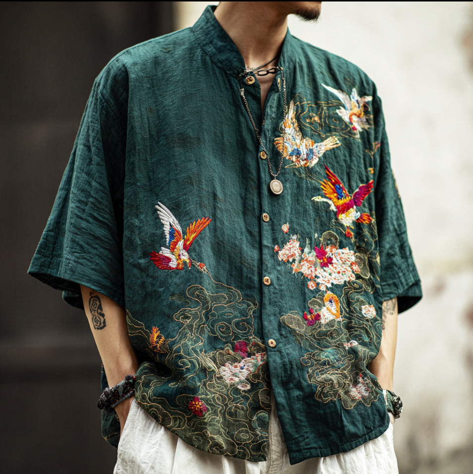 Japanese Art Style Bird And Flower Pattern Men's Cotton And Linen Short Sleeve Shirt