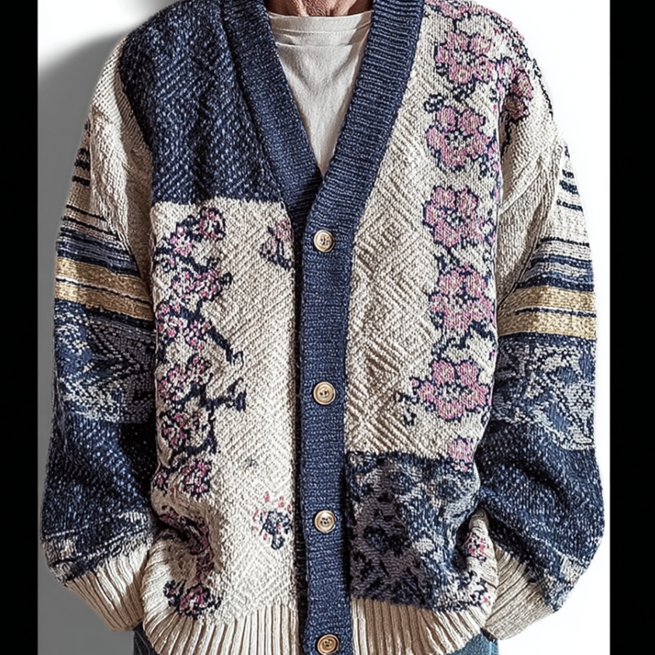 Japanese Art Style Geometric Color Blocks And Plant Flower Patterns Men's Retro Cardigan Sweater Jacket