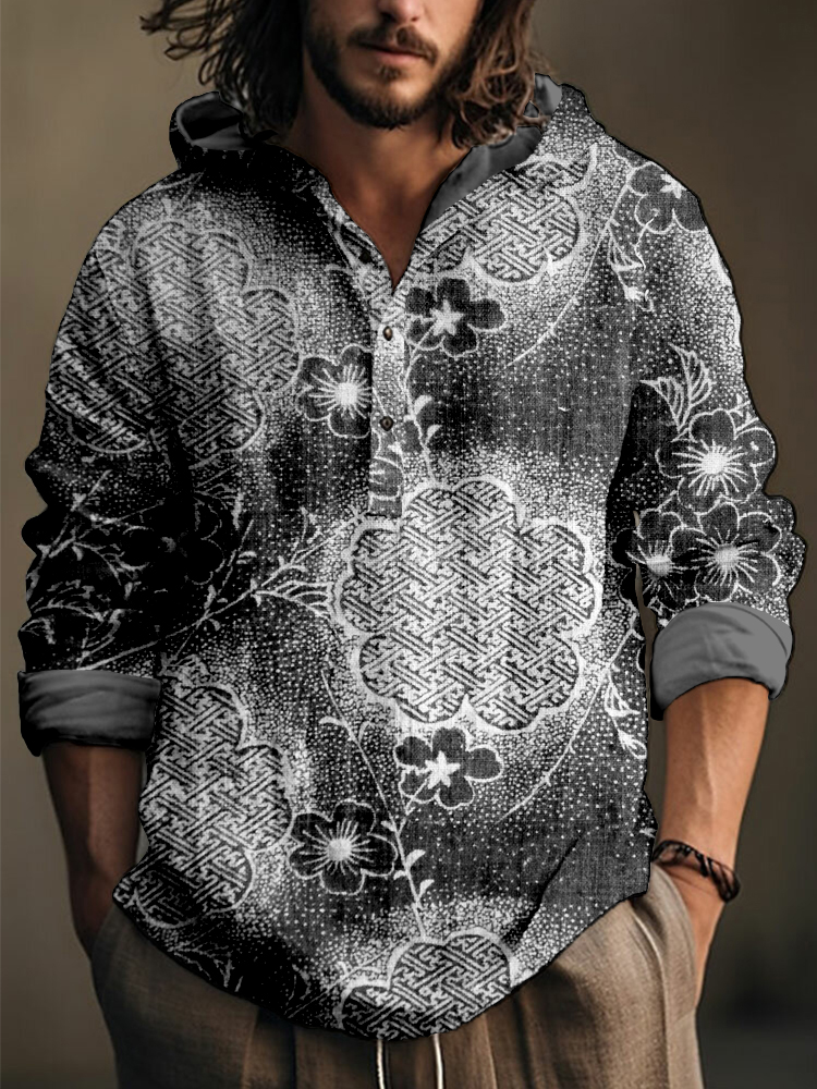 Japanese Cherry Blossom & Sayagata Patterns Linen Blend Hooded Shirt
