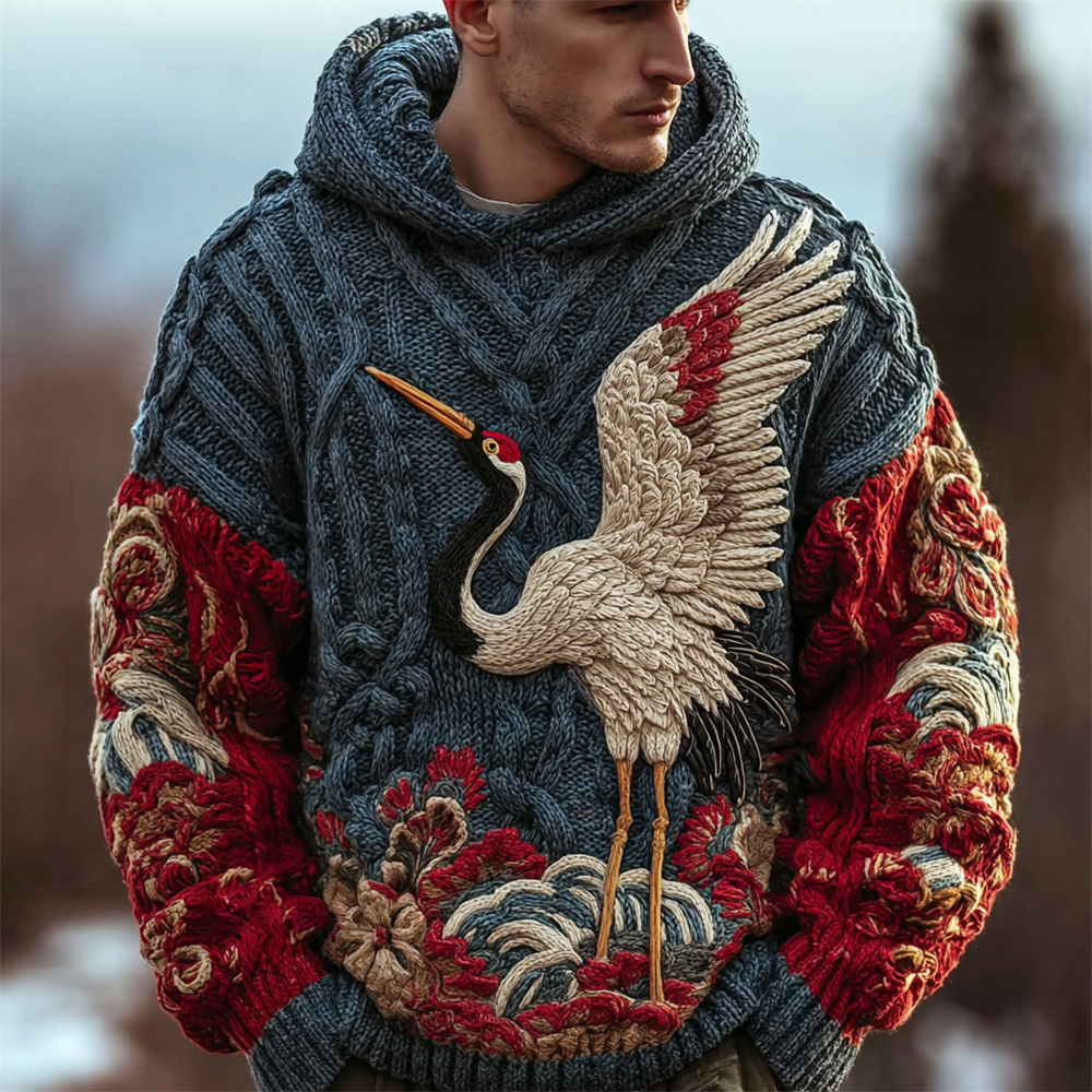 Japanese Crane Art Men's Twist Knit Hooded Sweater