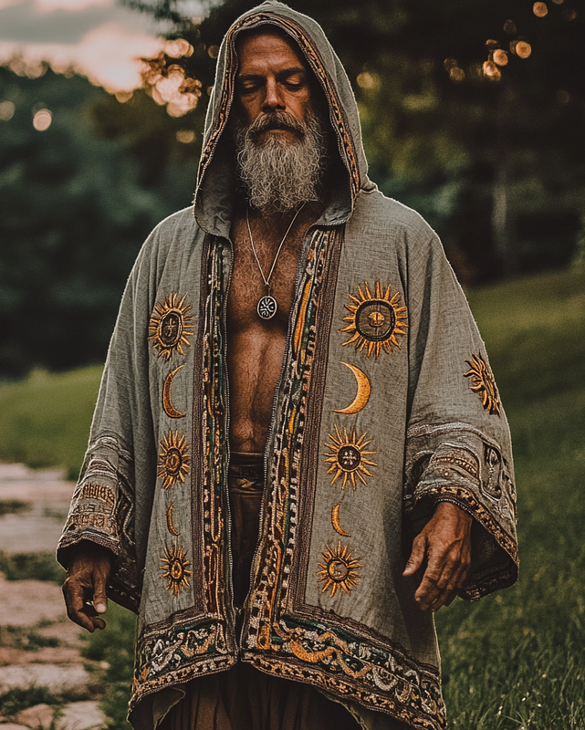 Men's casual and comfortable star and moon 3D embroidered linen hooded Kafta-style cardigan d6f6