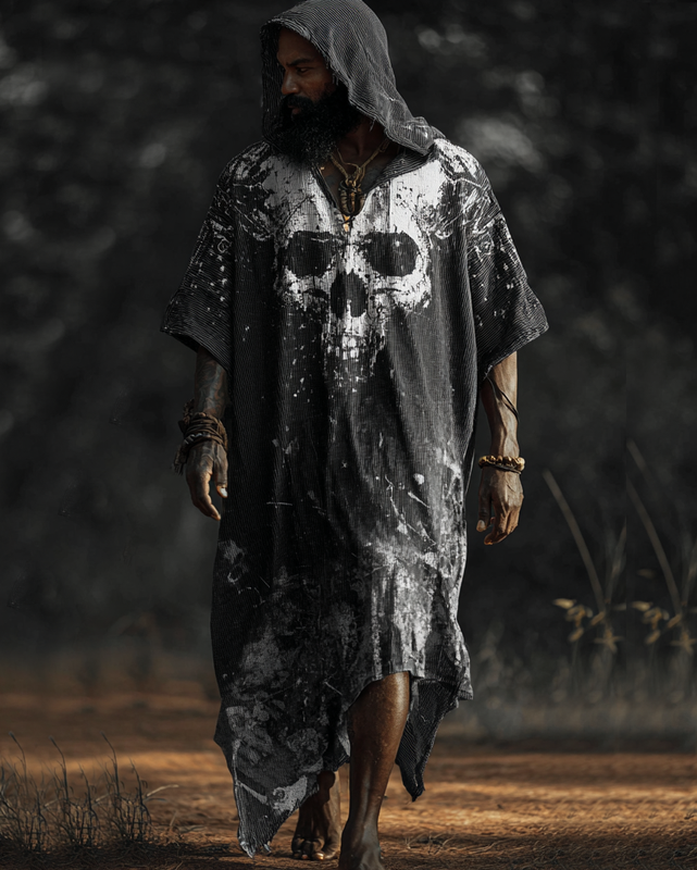 Men's Halloween themed skull print waffle hooded kaftan db40