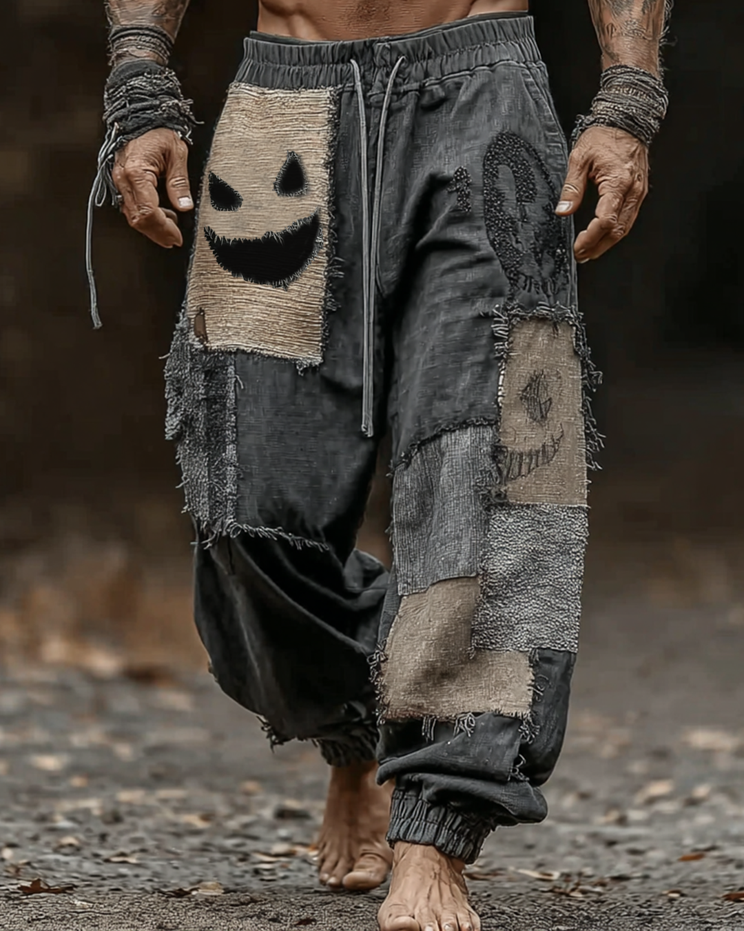 Men's casual Halloween spooky smiley face patch 3D embroidery contrast color patchwork linen trousers gy4y