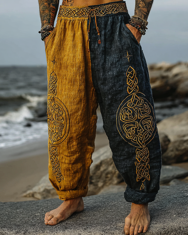 Men's Casual Viking Kettle Weave 3D Embroidered Contrast Color Linen Pants f253