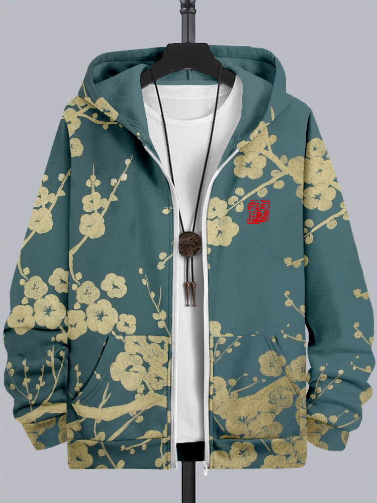 Men's Japanese Plum Blossom Art Comfy Full Zip Hoodie