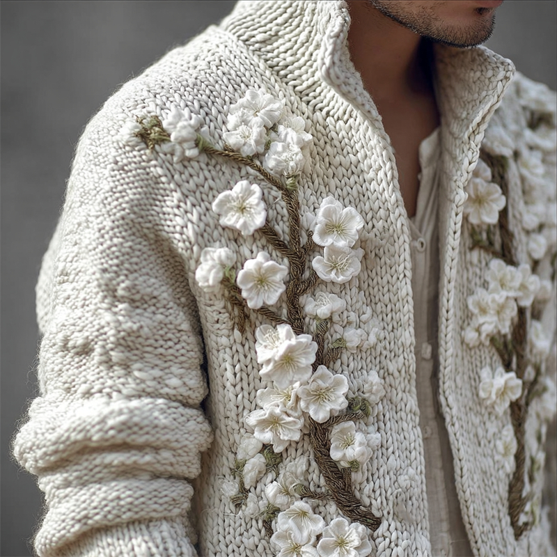 Men's Japanese White Almond Blossom Crochet Cozy Knit Cardigan