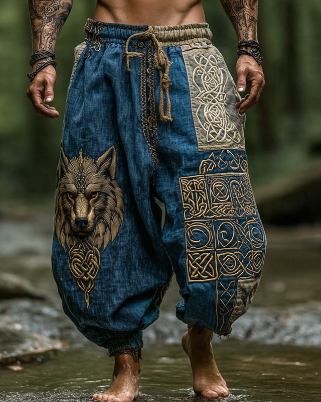 Men's Viking Kettle Woven Tribal Wolf Totem Linen Pants152c