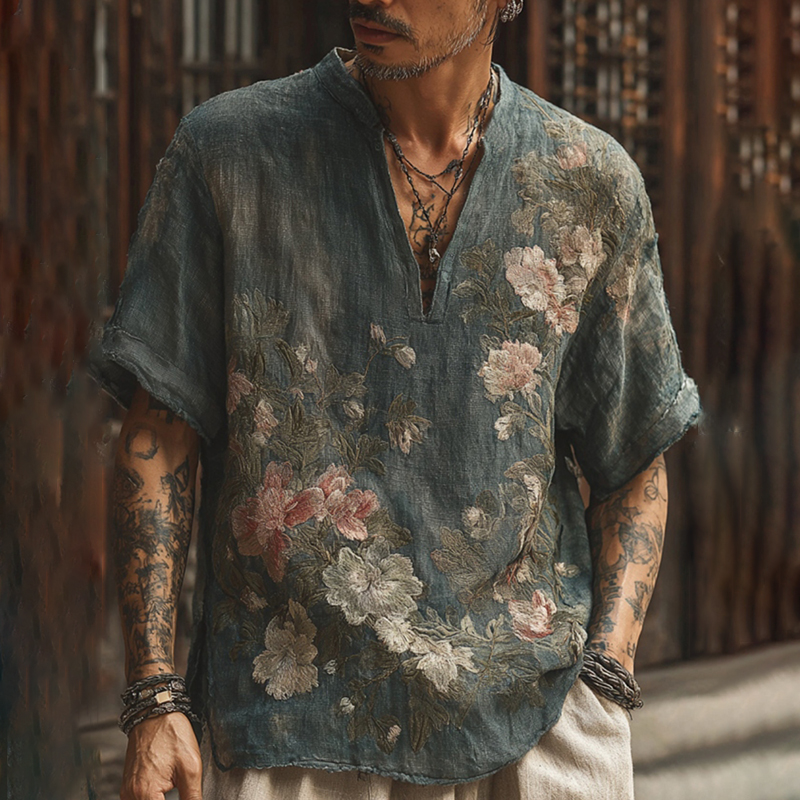 Men's Retro Floral Embroidery Casual Short Sleeve Shirt