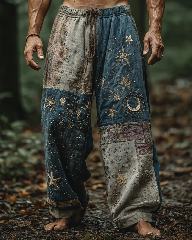 Men's summer vacation star and moon embroidered contrast color stitching linen trousers 2d1f