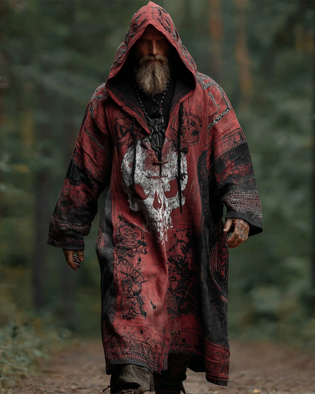 Men's Viking Vegvisir Bloody Skull Colorblock Hooded Kaftan 603f
