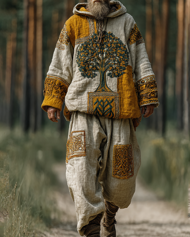 Men's Vacation Viking Tree of Life Three-Dimensional Embroidery Casual Contrast Color Stitching Hooded Sweatshirt & Pants Two-Piece Set fa42