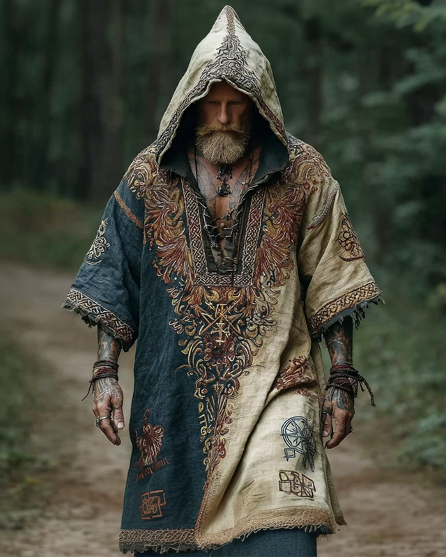 Men's Viking Celtic Knot Phoenix Totem Contrast Color-Paneled Linen Kaftan e182