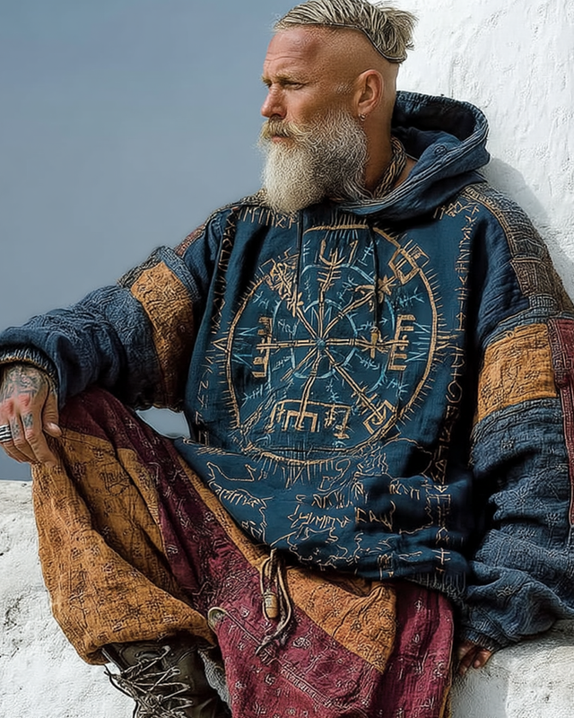 Men's Viking Compass Contrast Color Panel Hooded Sweatshirt 39d3