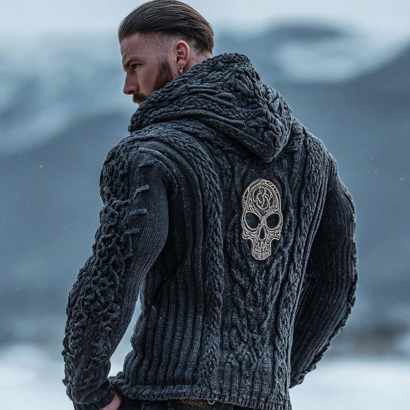 Men's Vintage Skull Embroidered Celtic Chunky Hooded Sweater