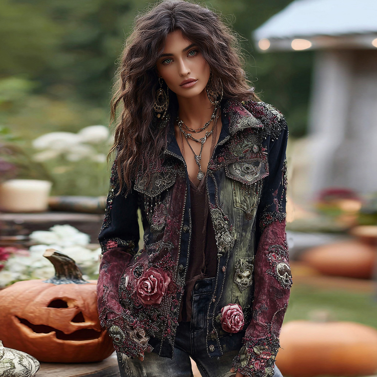 Rose And Skull Embroidered Gothic Gradient Denim Jacket