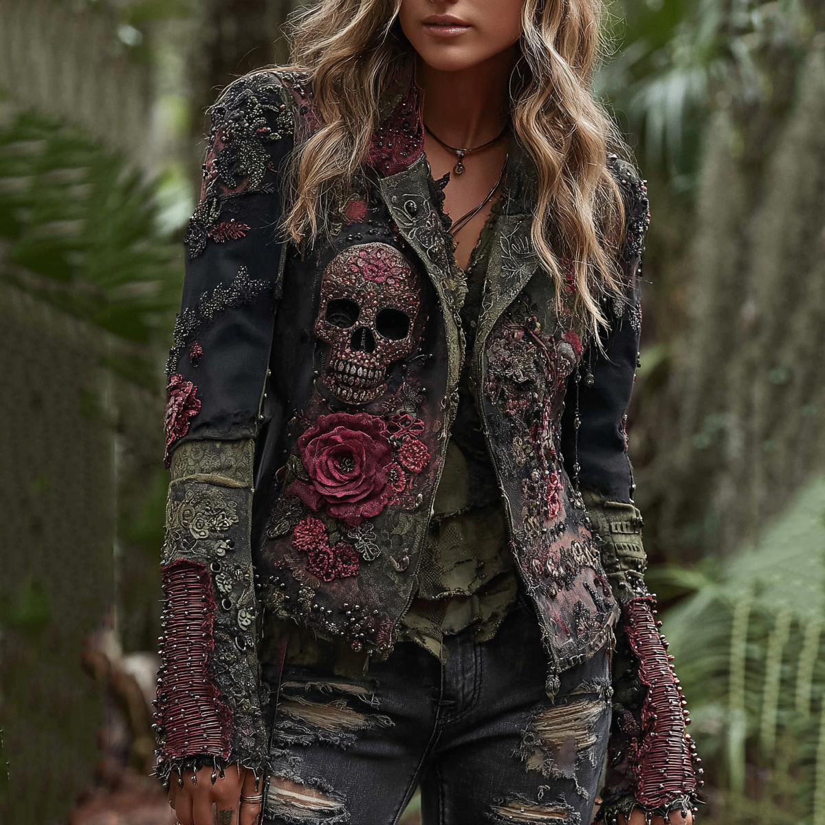 Rose And Skull Gothic Rock Contrast Lapel Denim Jacket