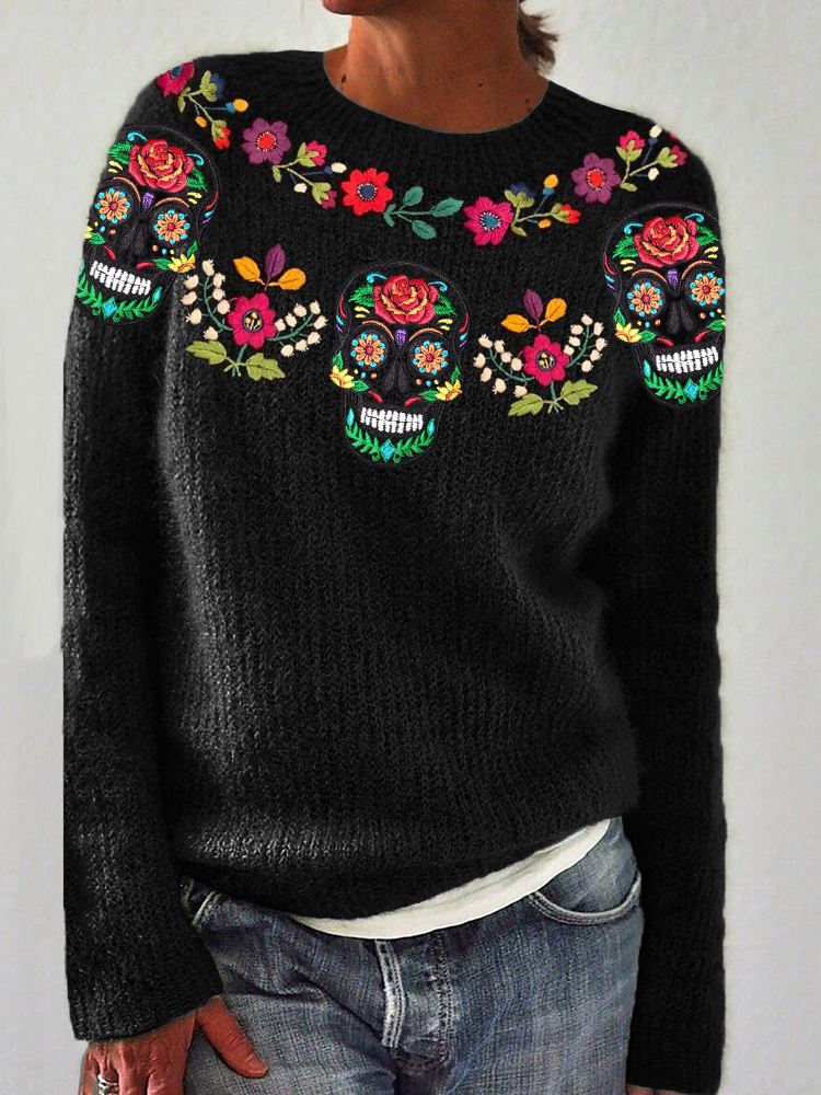 Sugar Skulls Mexican Floral Yoke Embroidered Cozy Sweater