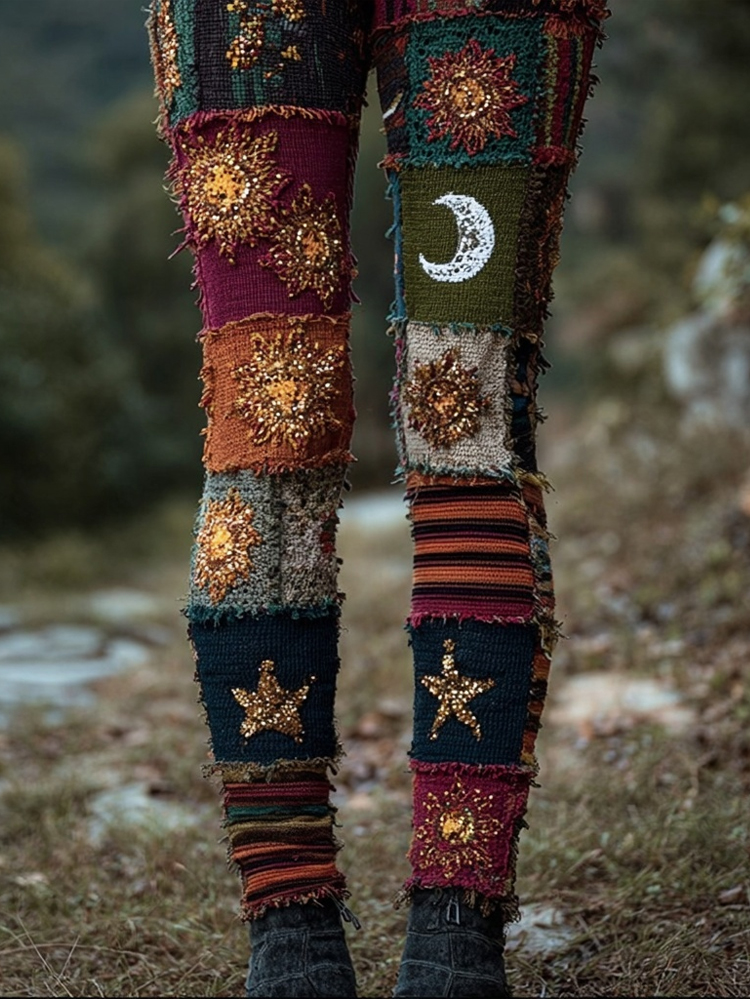 Vintage Moon & Sun Crochet Patchwork Knit Leggings