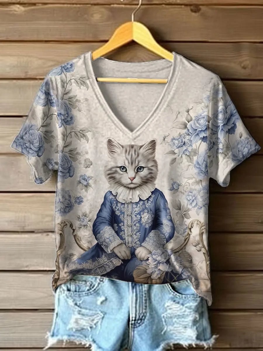 Women's Blue Floral Cat Print T-Shirt