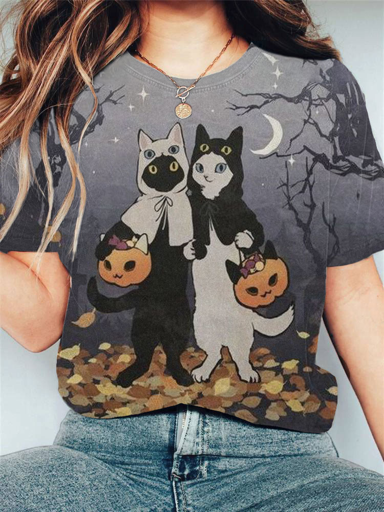 Women's Casual Halloween Funny Cat Print T-shirt