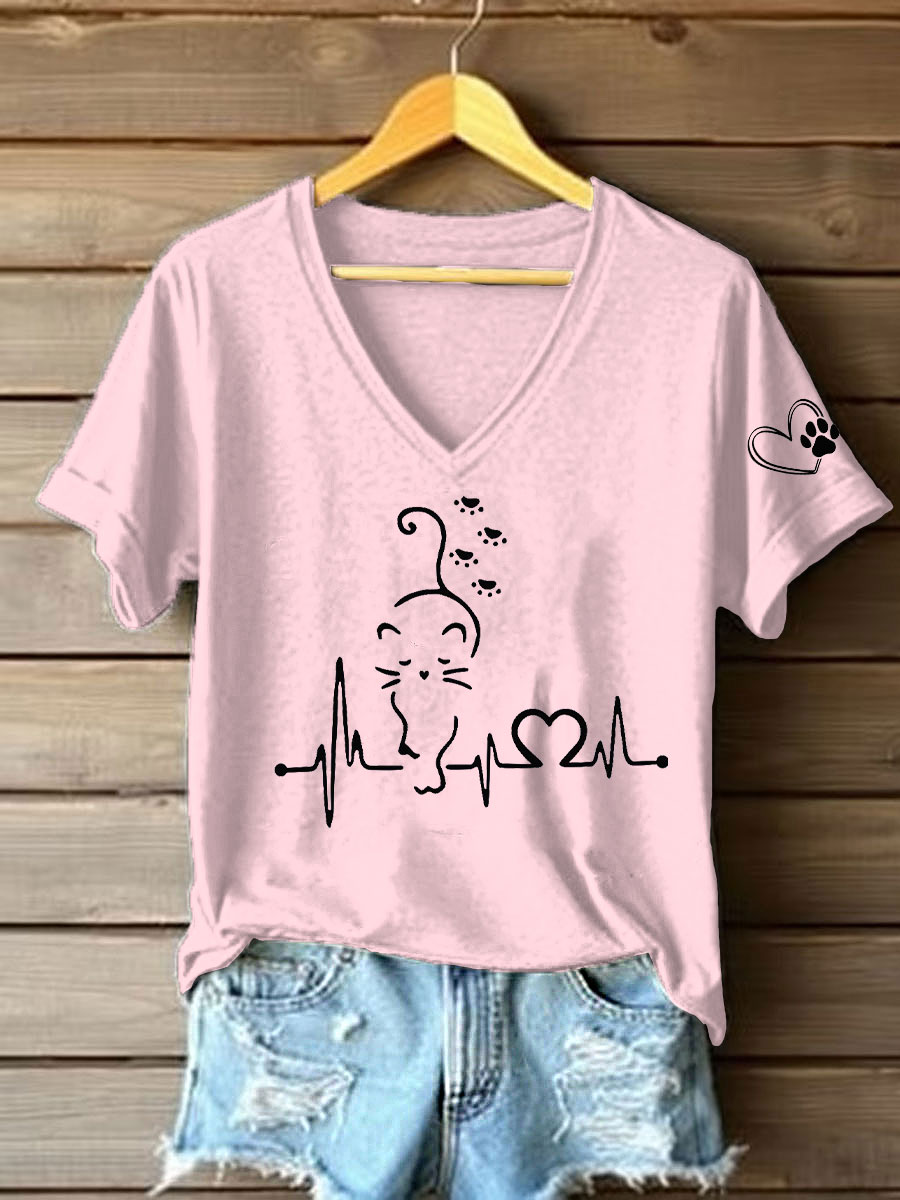 Women's Cat Heartbeat Printed Casual T-Shirt