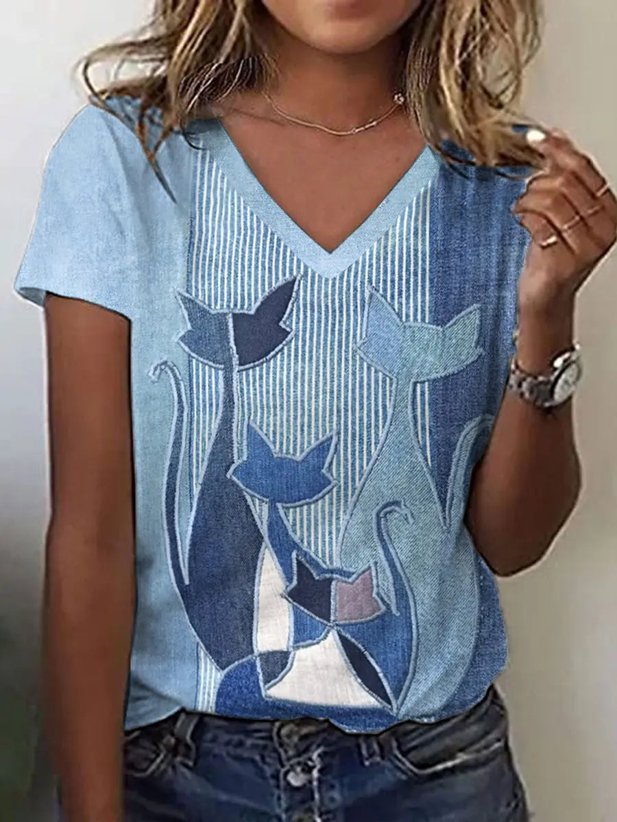 Women's Cute Cat Patchwork Art V-Neck T-Shirt