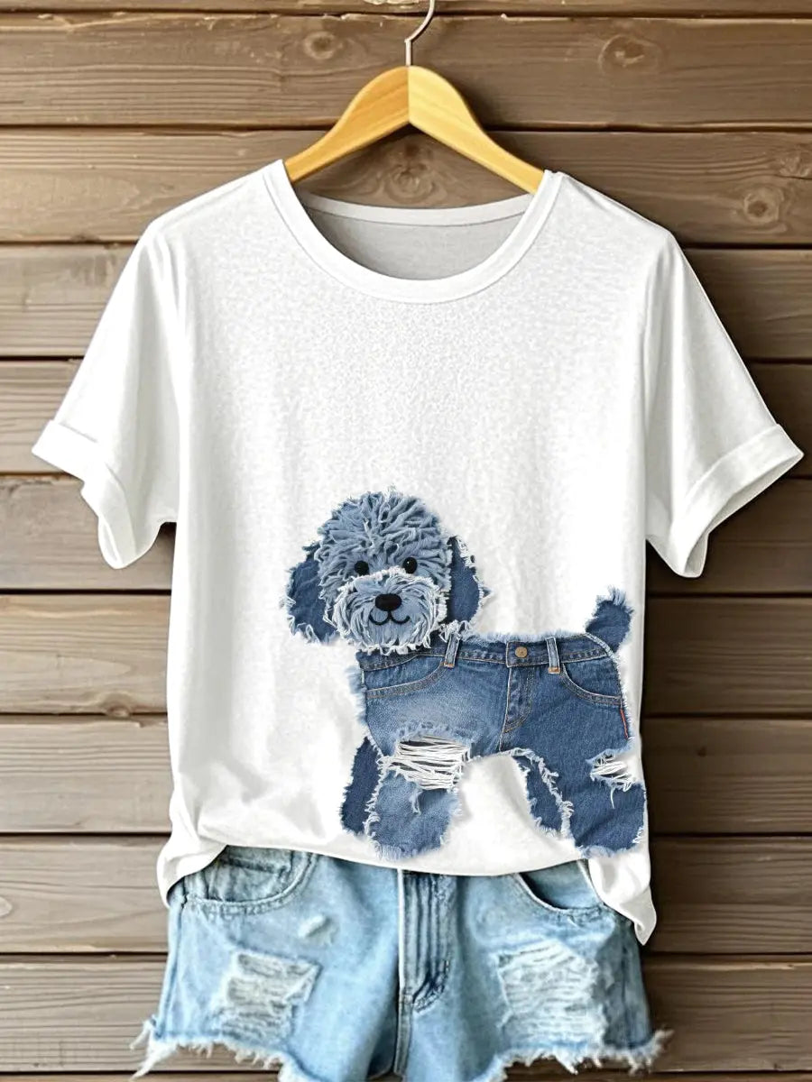 Women's Cute Dog Denim Patchwork Art T-shirt