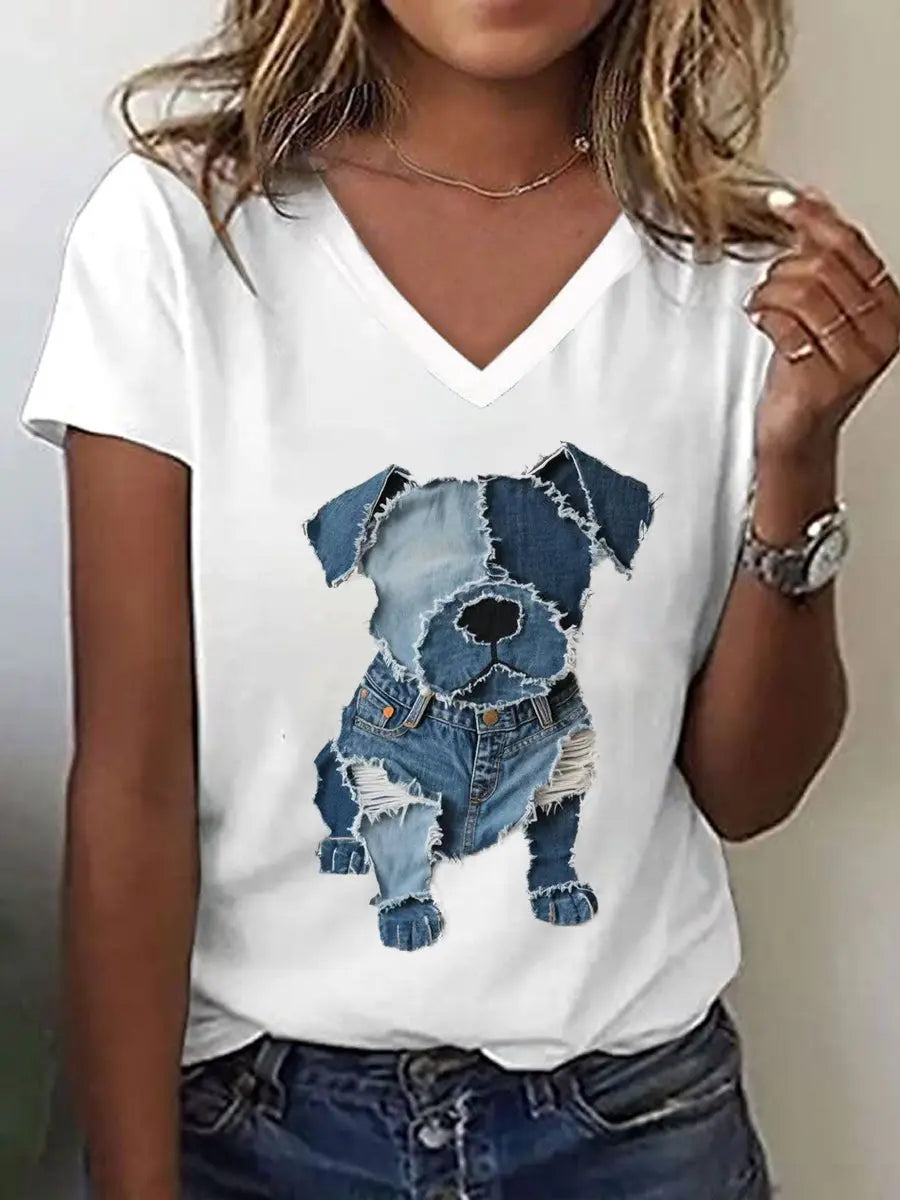 Women's Cute Dog Pattern Patchwork Art V-Neck T-Shirt