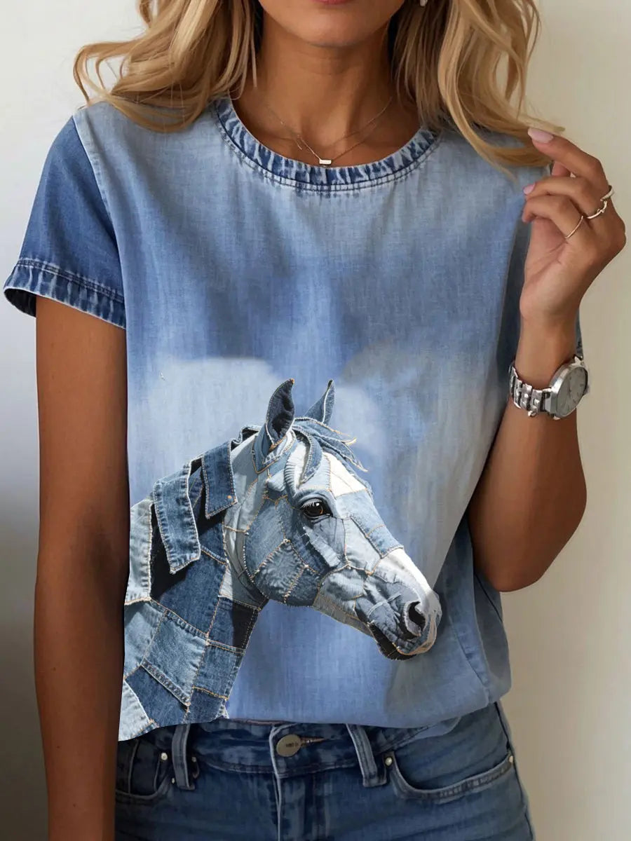 Women's denim horse print T-shirt