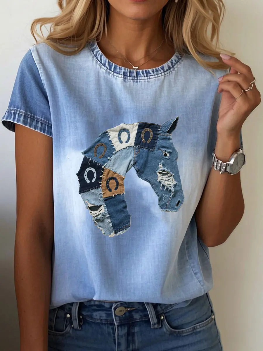 Women's denim horse print T-shirt