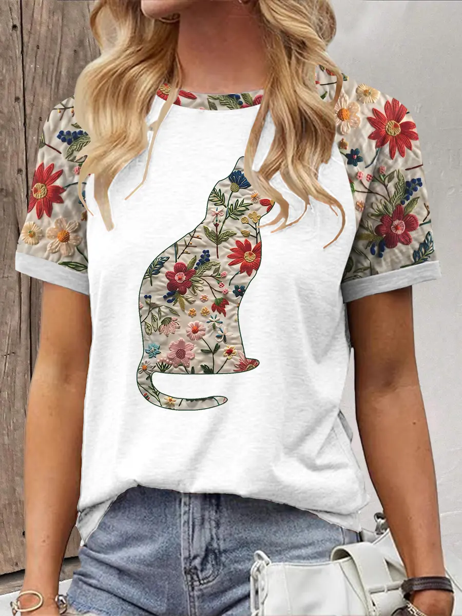 Women's Floral Cat Print Casual T-Shirt