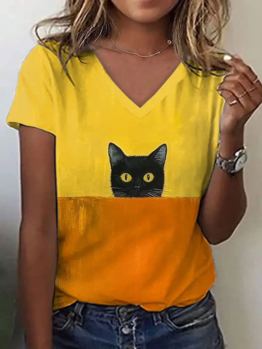 Women's Funny Cat Art Print Contrast Color V-Neck T-Shirt