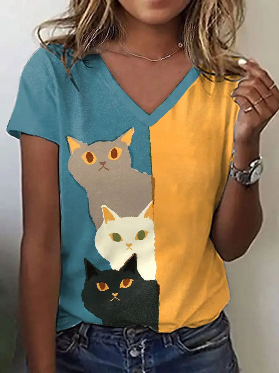 Women's Funny Cat Art Print V-Neck T-Shirt