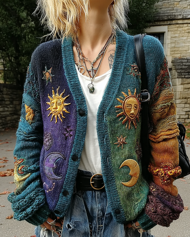 Women's soft and comfortable star and moon embroidery contrast color stitching knitted cardigan f311