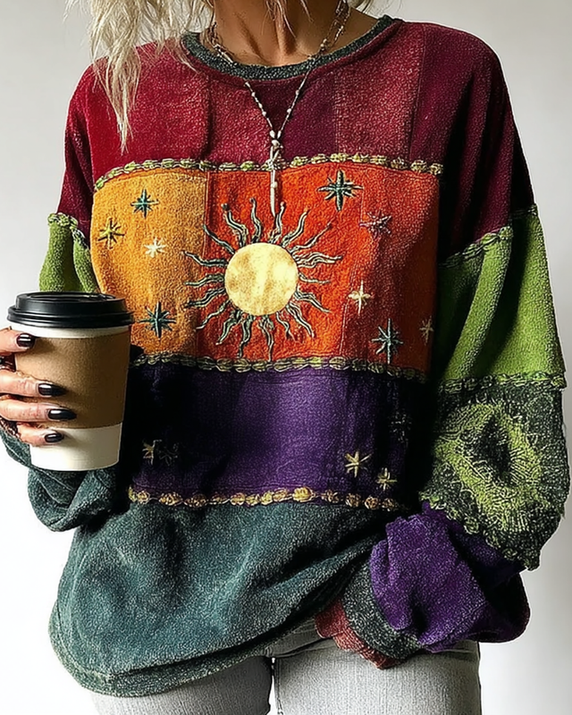 Women's Star and Moon 3D Embroidery Contrast Color Stitching Round Neck Top be3b
