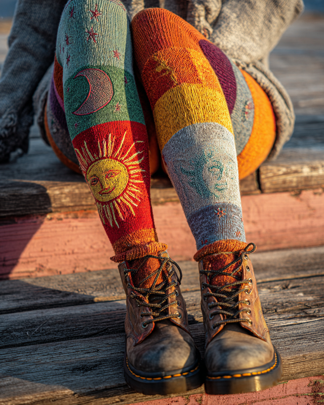 Women's Star and Moon Embroidery Contrast Color Comfortable Knitted Leggings d1fd