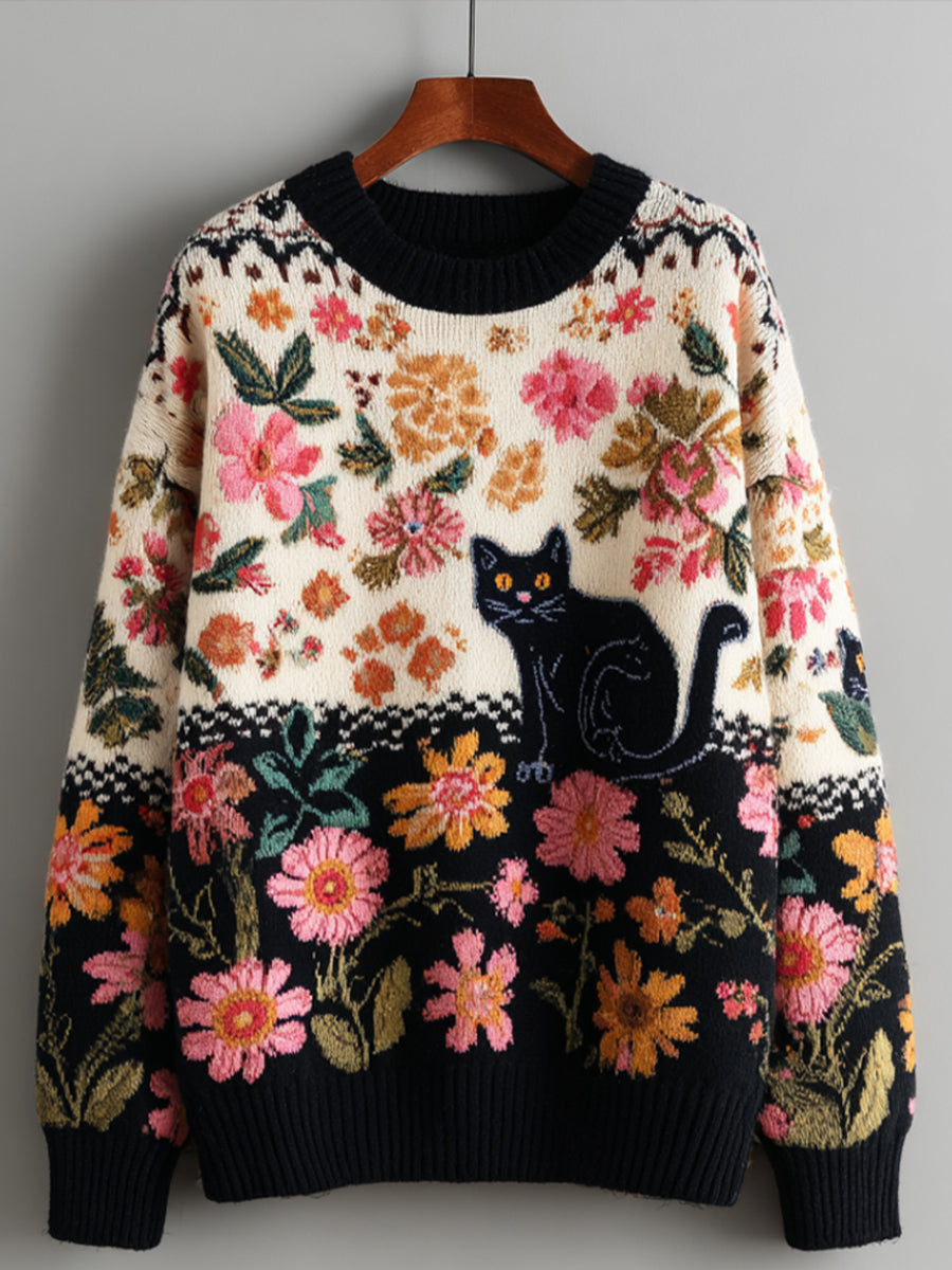 Women's Vintage Floral Kitten Art Print Sweater