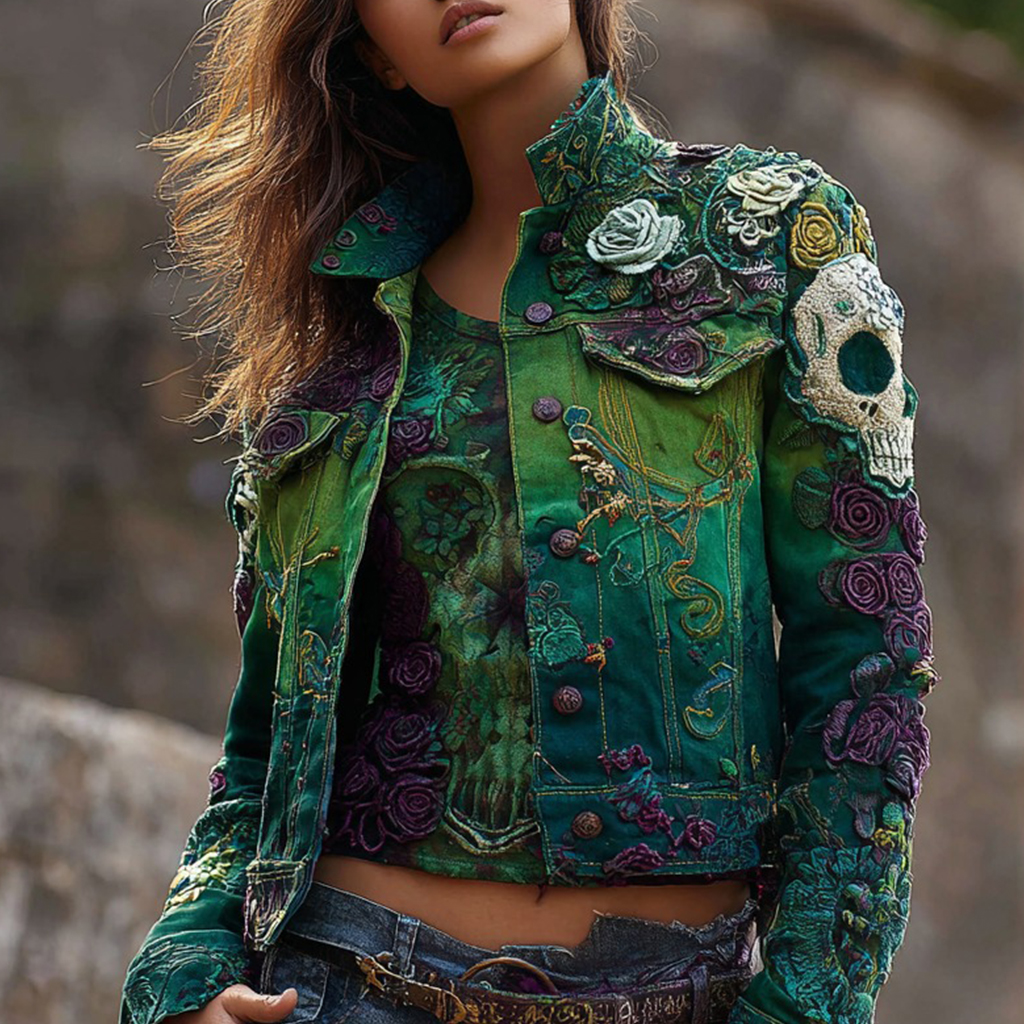 Women's Vintage Skull Rose Embroidered Gradient Denim Jacket